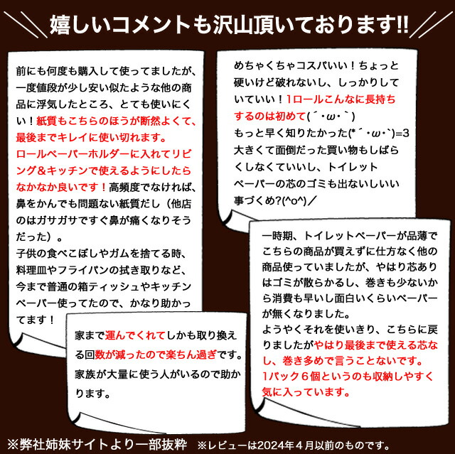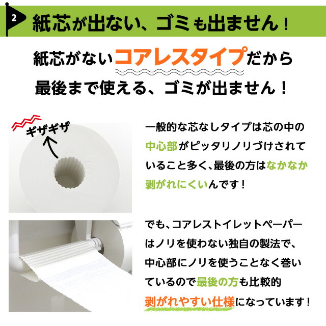 トイレットペーパーの交換てなんだか面倒だけど、これだと交換の回数も減るし、なんといってもロール芯がないのでゴミがでない!! これが当店人気のポイントなんです。
