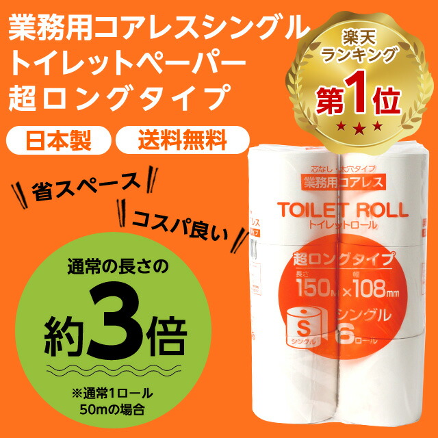 トイレットペーパー シングル 芯なし 業務用 150m 48ロール(6ロール×8パック) コアレス ロング